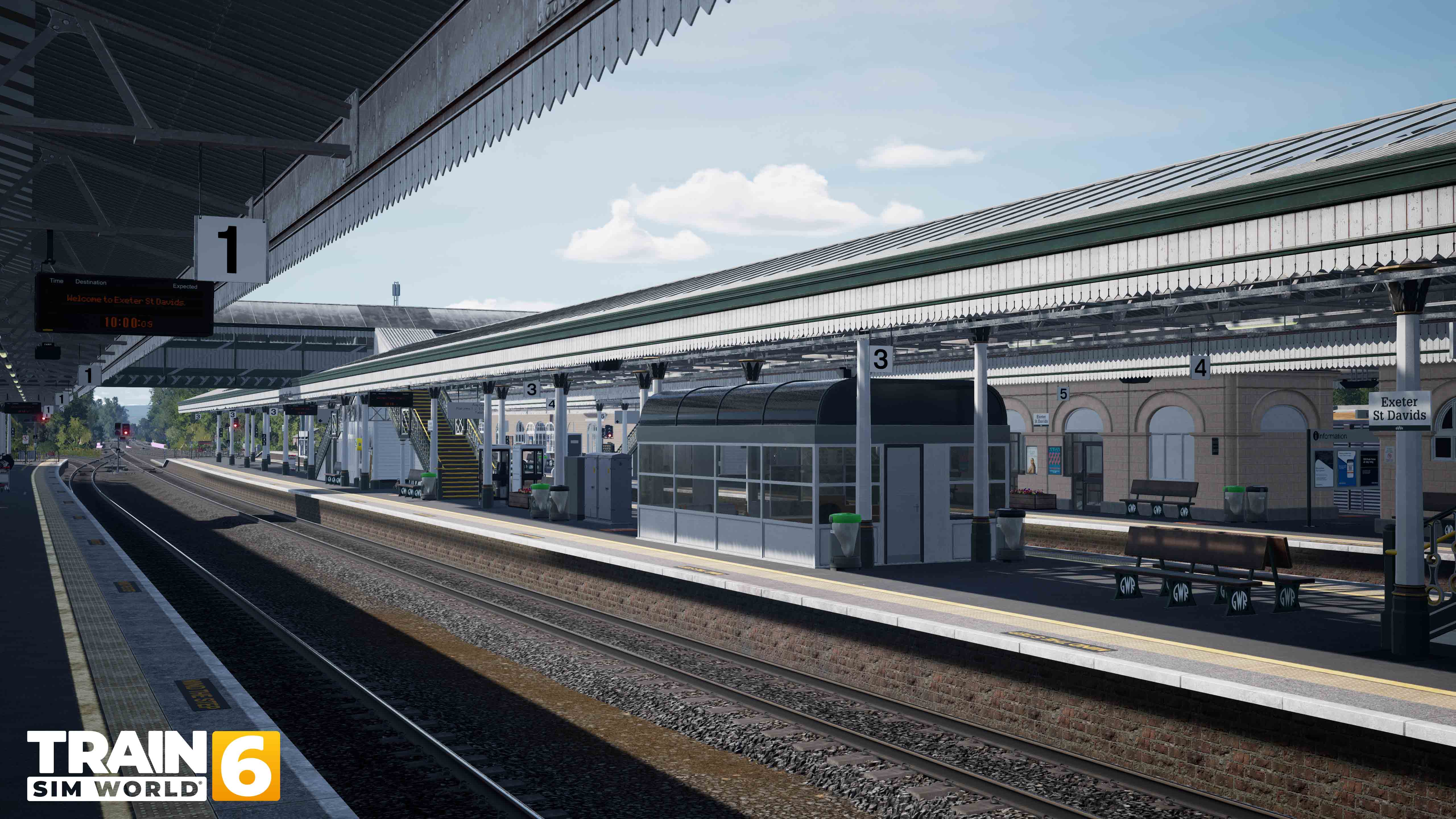 Exeter St Davids is the busiest station on the route, with eight playable trains per hour plus AI trains from off map locations such as Barnstaple, Okehampton and Exeter Central. It is also the terminus of Class 159 services from London Waterloo, which are represented by the East Midlands Trains Class 158, layering in from Midland Main Line. It's "close enough" to our eyes, but if you disagree you can always disable the layer in Layer Selector.